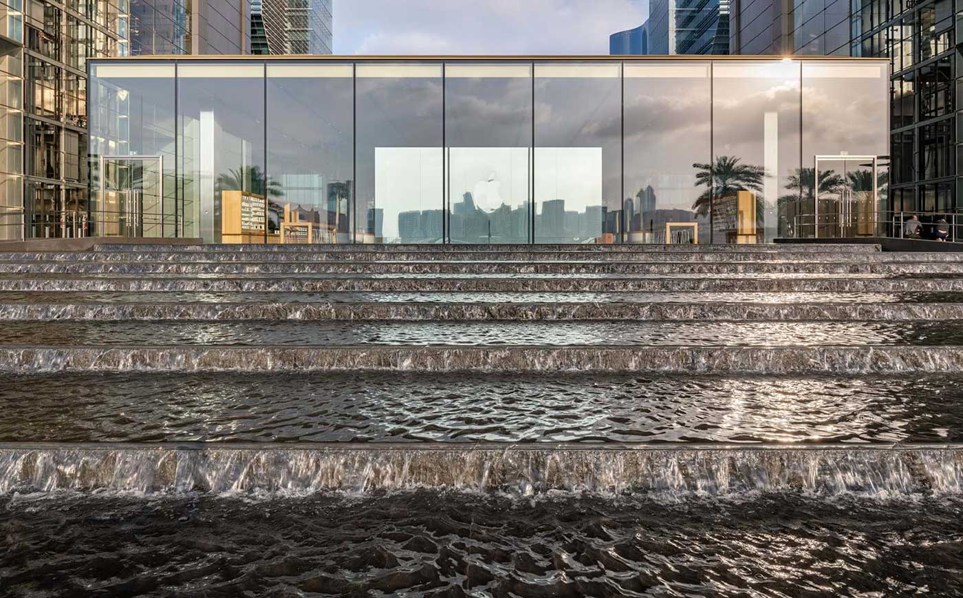 La cascata d’acqua scorre lungo una scalinata in granito Absolute Black; ai bordi, due rampe l’attraversano e raggiungono il rettangolo puro, completamente trasparente, dell’Apple Al Maryah inaugurato oggi sull’Al Maryah Island di Abu Dhabi, nel cuore del distretto finanziario della capitale degli Emirati. Lo stesso granito nero prosegue anche dentro il negozio, progettato, come gli altri Apple Store nel mondo, dallo studio londinese Foster + Partners.