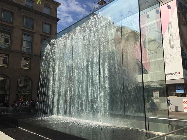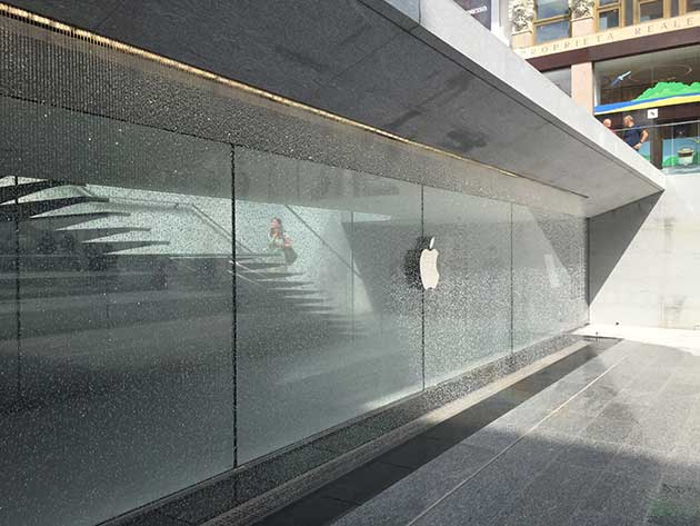 La cascata d´acqua che contorna il parallelepipedo d´ingresso al nuovo Apple store di Milano |