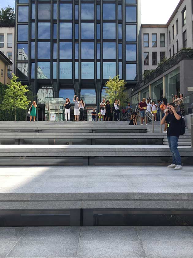 La scalinata in lastre di beola grigia che ha trasformato significativamente la conformazione di Piazza Liberty a Milano e, sotto, la piazza vista dall´alto. |