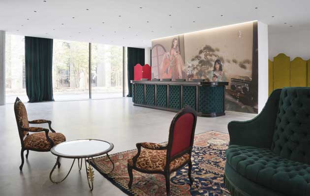 Il design degli interni degli edifici del campus riflette la visione e l’estetica del direttore creativo di Gucci Alessandro Michele. Arredare le singole aree è stato un esercizio di personalizzazione su misura: arredamenti e decorazioni sono stati attentamente considerati, valutati e selezionati. Si tratta di pezzi unici: poltrone da teatro, vecchi piani di lavoro da bar, schermi vintage, poltrone e tavolini contribuiscono a creare un’atmosfera piacevole, rilassata. Niente è noioso. Come risultato di un’intelligente operazione di styling, in ogni angolo c’è un pezzo interessante.