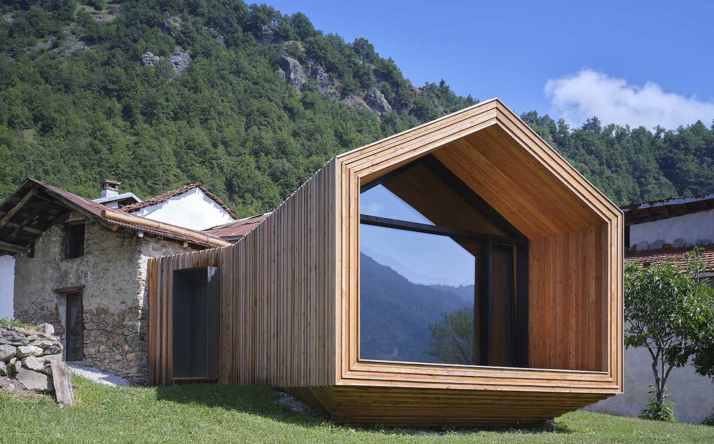 L’estensione in legno, realizzata a partire dalla falda del tetto originale, si sviluppa dilatandosi alla ricerca dell’affaccio migliore.
