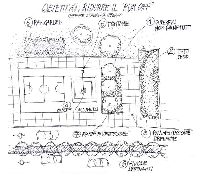 Alcune misure e superfici che è possibile mettere in atto in superficie per limitare il runoff 1 Maggiore estensione delle superfici non pavimentate 2 Tetti verdi 3 Pavimentazioni drenanti 4 Vasche di accumulo 5 Fontane 6 Rain Garden (superfici vegetate che permettono l´accumulo di acqua, favoriscono la permeabilità dei suoli e l´evaporazione dell´acqua) 7 Piante e vegetazione 8 Aiuole drenanti disegno ©Carlo Ezechieli |