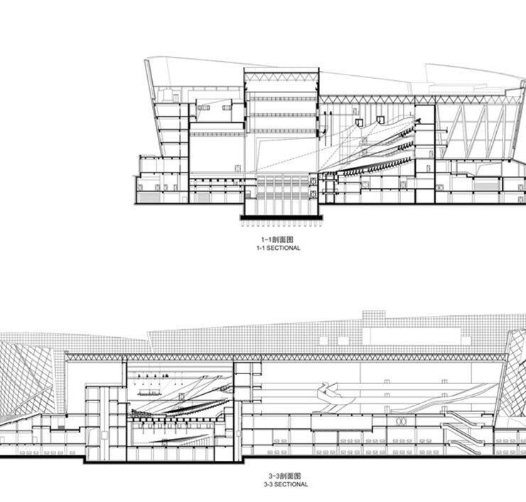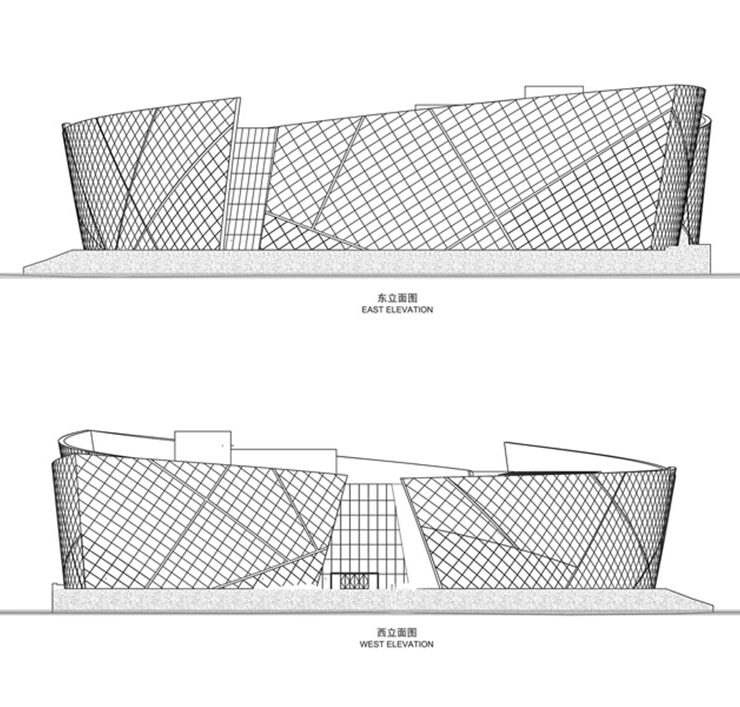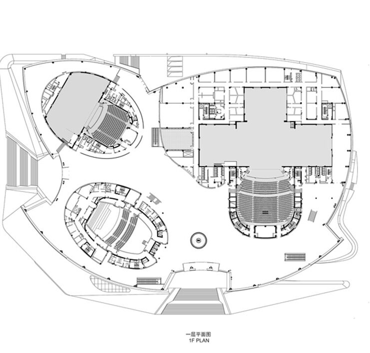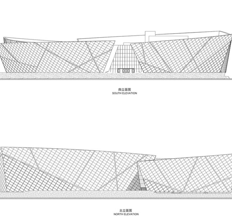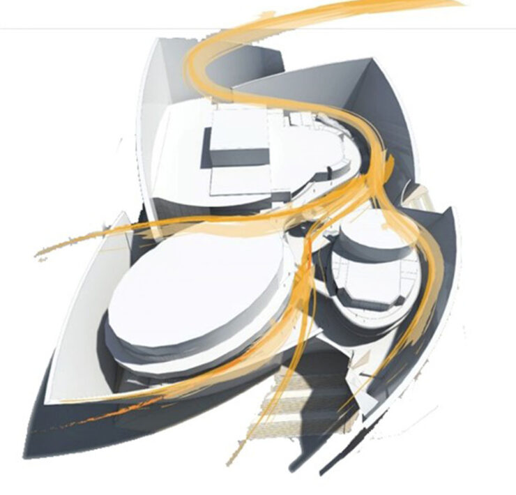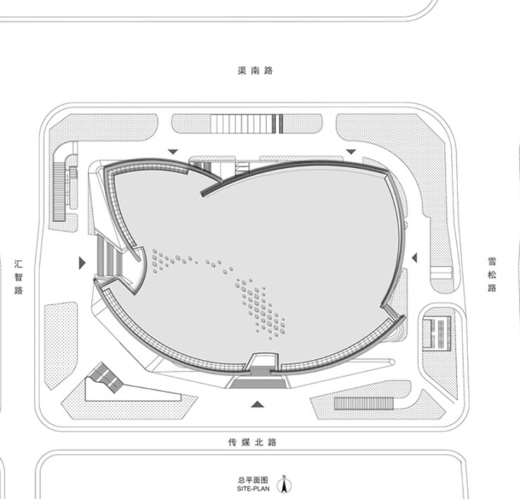 Come raccontano gli architetti, il progetto si ispira all’immagine di “una nave che naviga sul fiume Giallo”. L’idea della nave caratterizza le scelte formali che sono anche debitrici delle complessità funzionali affrontate e risolte, come l’offerta di quattro sale principali indipendenti con conseguente disposizione delle sale, della circolazione e della logistica.