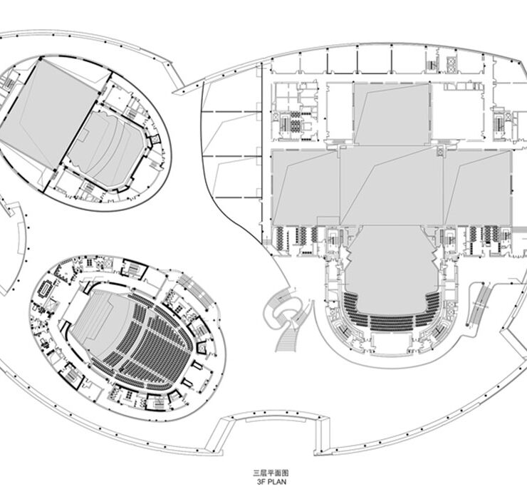 Trattate come forme distinte all’interno dell’edificio, tutte le sale sono unite da foyer e da spazi di circolazione progettati pensando alla fluidità del vicino fiume Giallo.