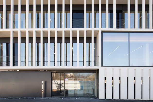 Sul lato opposto all’ingresso il fronte si fa invece più compatto, con un ritmo serrato di aperture verticali: si tratta delle facciate sud, est e ovest, dove è necessario filtrare l’irraggiamento solare e creare una barriera acustica contro il rumore generato dal vicino passaggio dei treni.
