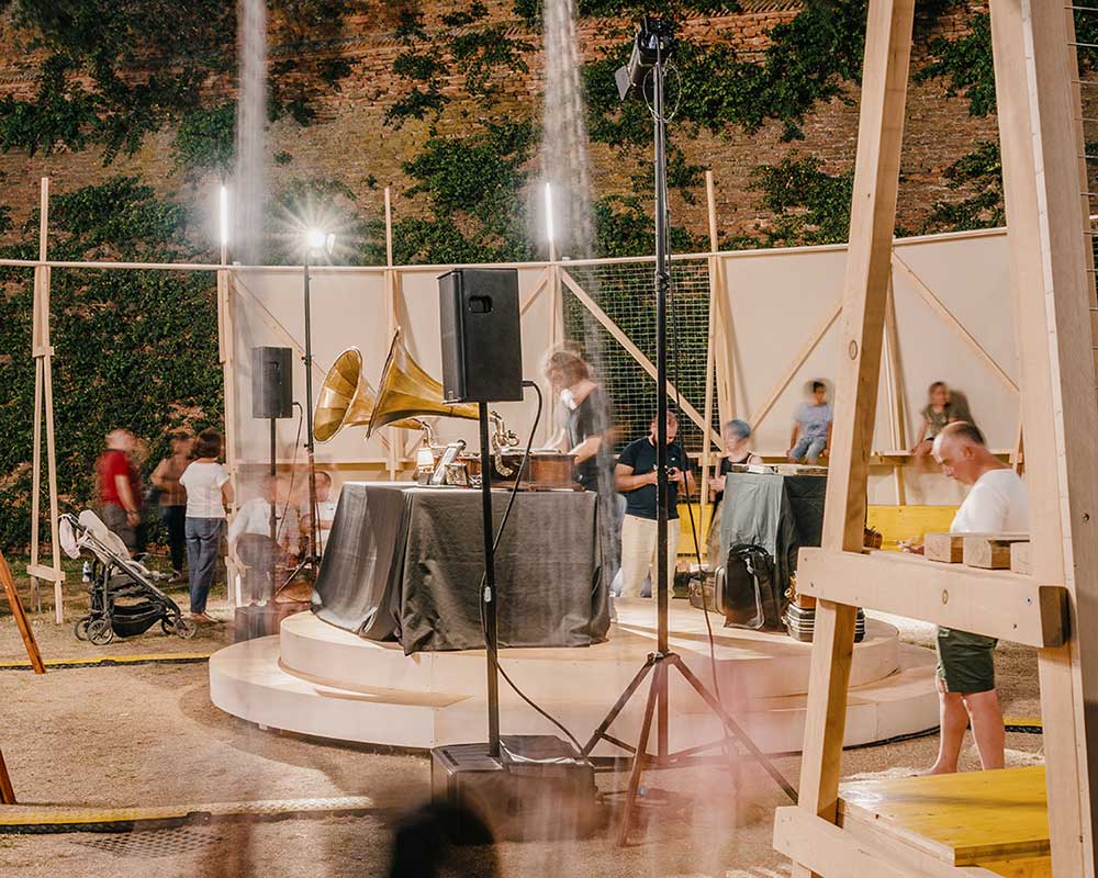 Un recinto circolare e permeabile, una stanza a cielo aperto che abbraccia una porzione di spazio pubblico per accogliere, per tutta la stagione estiva, esperienze multiformi.