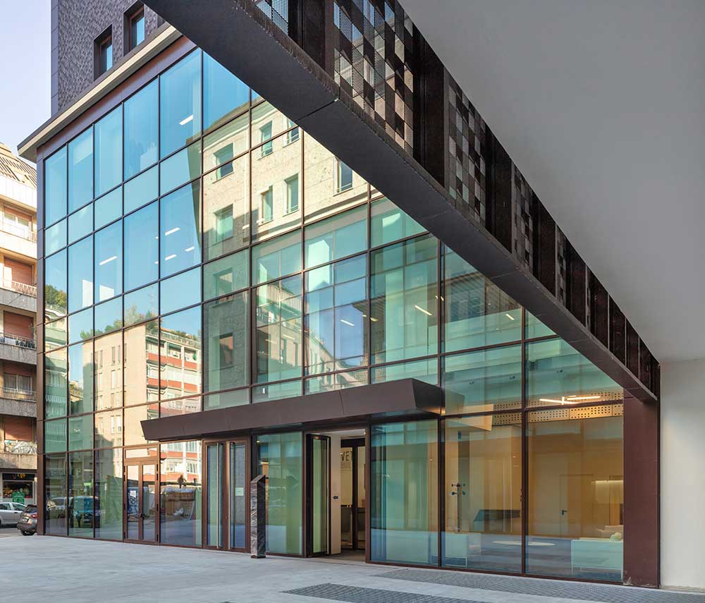 Tra i due corpi di fabbrica dell’edificio, che sviluppa una superficie complessiva di quasi 30mila metri quadrati su cinque livelli e una food court al piano terra, si apre ora una piccola piazza pubblica che connette il quartiere con il Parco delle Basiliche, sul quale si affaccia il fronte principale dell’edificio.
