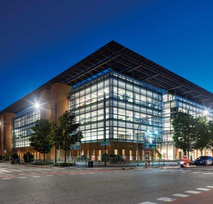 Tra i due corpi di fabbrica dell’edificio, che sviluppa una superficie complessiva di quasi 30mila metri quadrati su cinque livelli e una food court al piano terra, si apre ora una piccola piazza pubblica che connette il quartiere con il Parco delle Basiliche, sul quale si affaccia il fronte principale dell’edificio.
