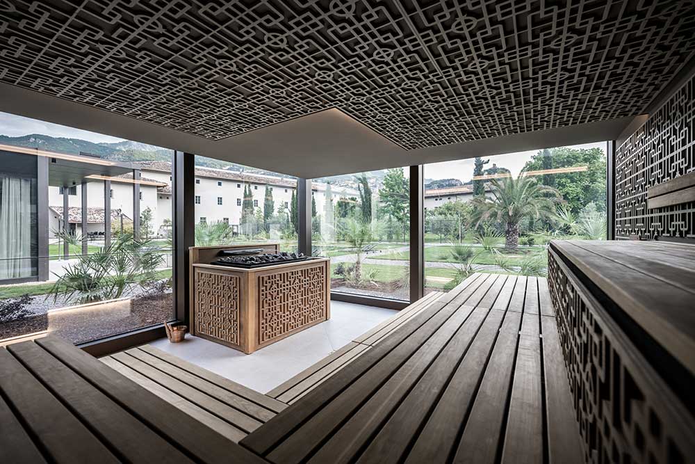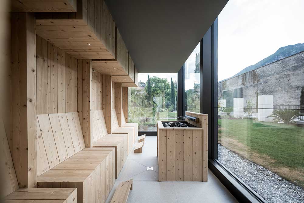 Realizzata ex novo nel giardino del monastero, l’area wellness è caratterizzata da sette volumi leggeri in vetro e metallo, posizionati lungo una spina dorsale in pietra. L’alternanza di corpi vetrati e di corti verdi crea un suggestivo gioco di avanzamento e di arretramento di volumi. Le ossature metalliche leggere, ordinate in montanti e traversi, si ispirano alle ‘limonaie’ caratteristiche del contesto rurale del Lago di Garda.