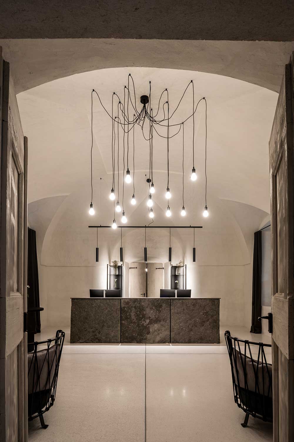 La reception si caratterizza per il grande bancone in pietra, rivestito in granito e illuminato da una ‘pioggia’ di lampade sospese dal disegno minimalista. Intorno, solo la presenza leggera di poltrone in ferro battuto.