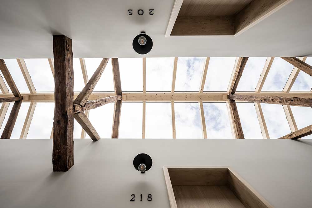 Al colmo del tetto, un lucernario corre per tutta la lunghezza della copertura, illuminando non solo il corridoio, ma anche le camere, grazie a vetrate sopraluce.