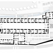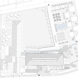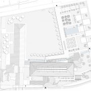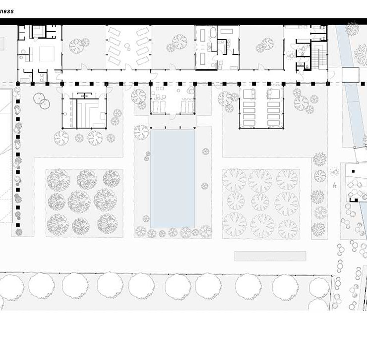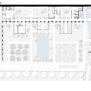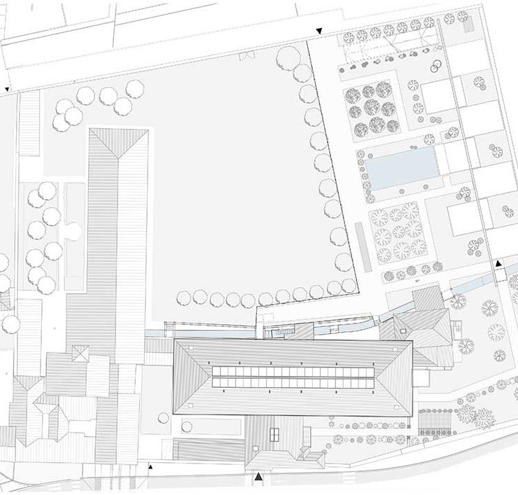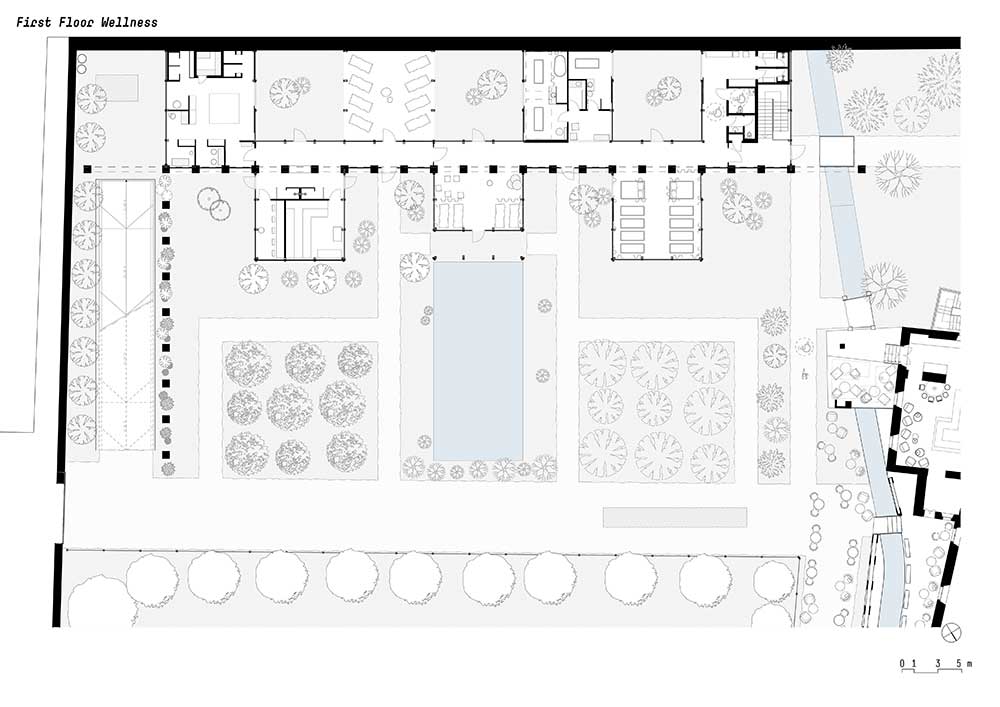 La spina centrale di raccordo – composta da una serie di pilastri rivestiti in pietra di Vicenza, le cui cromie ricordano quelle delle costruzioni preesistenti, e da un architrave orizzontale in cemento prefabbricato e sabbiato – riprende nelle sue fattezze la ‘pilastrata’ lapidea del canale sopraelevato che corre sul lato orientale del convento. Nel giardino è stato realizzato anche un ‘biolago’, uno specchio d’acqua dal carattere naturale e dai riflessi blu scuro, e un percorso benessere che ruota intorno a una grande pietra scura riscaldata.
