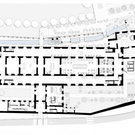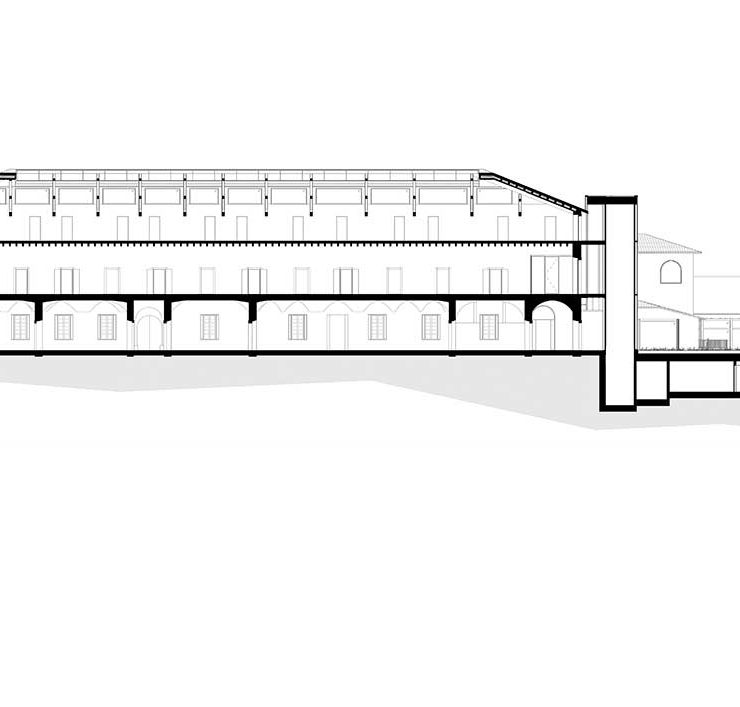 All’interno il monastero si sviluppa su tre livelli, con un’articolazione degli spazi molto diversa piano per piano. «Si va dagli spazi concentrici del piano terra – spiega Padovan – al maestoso corridoio del primo piano, alla selva di travi lignee del sottotetto. Su questa varietà di ambienti abbiamo lavorato, definendo soluzioni che non alterassero i diversi disegni, ma ne restituissero rafforzati il fascino e l’originalità».