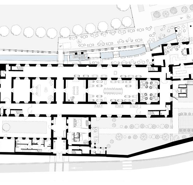 Negli spazi pubblici al piano terreno, soffitti e decori in gesso sono stati conservati e restaurati. Dominano il bianco, il grigio e il nero, colori storici del monastero.