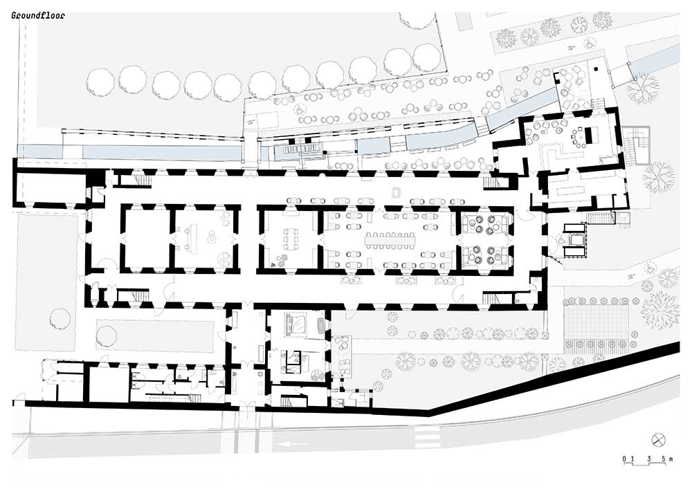 Così, al piano terra l’organizzazione degli spazi pubblici è stata definita enfatizzando i percorsi esistenti: lungo l’asse centrale, sotto le volte a crociera e circondate da un lungo corridoio che le abbraccia, si susseguono la reception, la sala colazione e una sala lettura/lounge. Qui trovano spazio anche il bar e una cucina, e sempre al piano terra è stata ricavata una suite direttamente affacciata su un giardino privato.