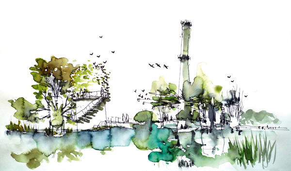 Il risultato è un nuovo ecosistema in grado di attrarre specie migratorie che porteranno con sé semi favorendo una rinascita della flora, certo diversa dall’esistente ma probabilmente anche dal paesaggio che precedeva gli insediamenti industriali. Che, capaci anche di svolgere funzioni per forme di nuova agricoltura, attività artigianali e artistiche, diventeranno a loro volta costitutivi del paesaggio, che è sempre il risultato di modificazioni indotte dal lavoro dell’uomo.