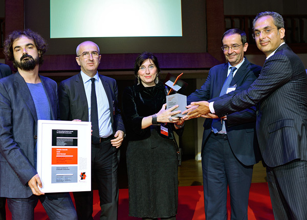 | da sinistra, Francisco Leiva, Marco Scarpinato e Lucia Pierro ricevono il premio Holcim Gold Award Europe 2014 da Bernard Fontana e Piero Corpina, rispettivamente CEO di Holcim Switzerland e Holcim Italia |