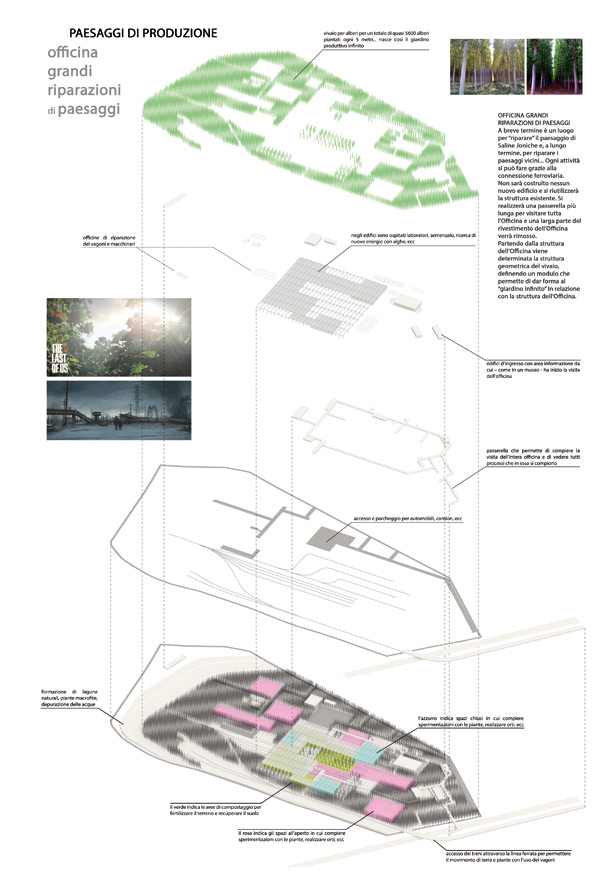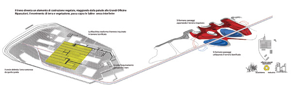 Un progetto che si confronta con il tema della “rovina”, intesa non già come reperto archeologico ma come abbandono di strutture industriali recenti che nel loro dispiegarsi hanno coinvolto una larga porzione di territorio. Favorendo, con interventi minimi e la necessaria bonifica dei terreni, la morfologia del luogo, il progetto punta a ripristinarne la natura lagunare, creando un ambiente umido tappa di sosta ideale per gli uccelli migratori, lasciando intatti i segni delle attività industriali dell’uomo.