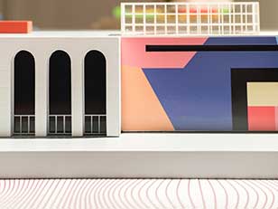 I modelli in legno e metacrilato colpiscono per la ricchezza cromatica e per l’aspetto pittorico che caratterizza edifici come la Triennale di Incheon in Corea o il Polo Natatorio Bruno Bianchi di Trieste, la cui facciata esterna riprende il decoro Proust, realizzati con laminati Abet.