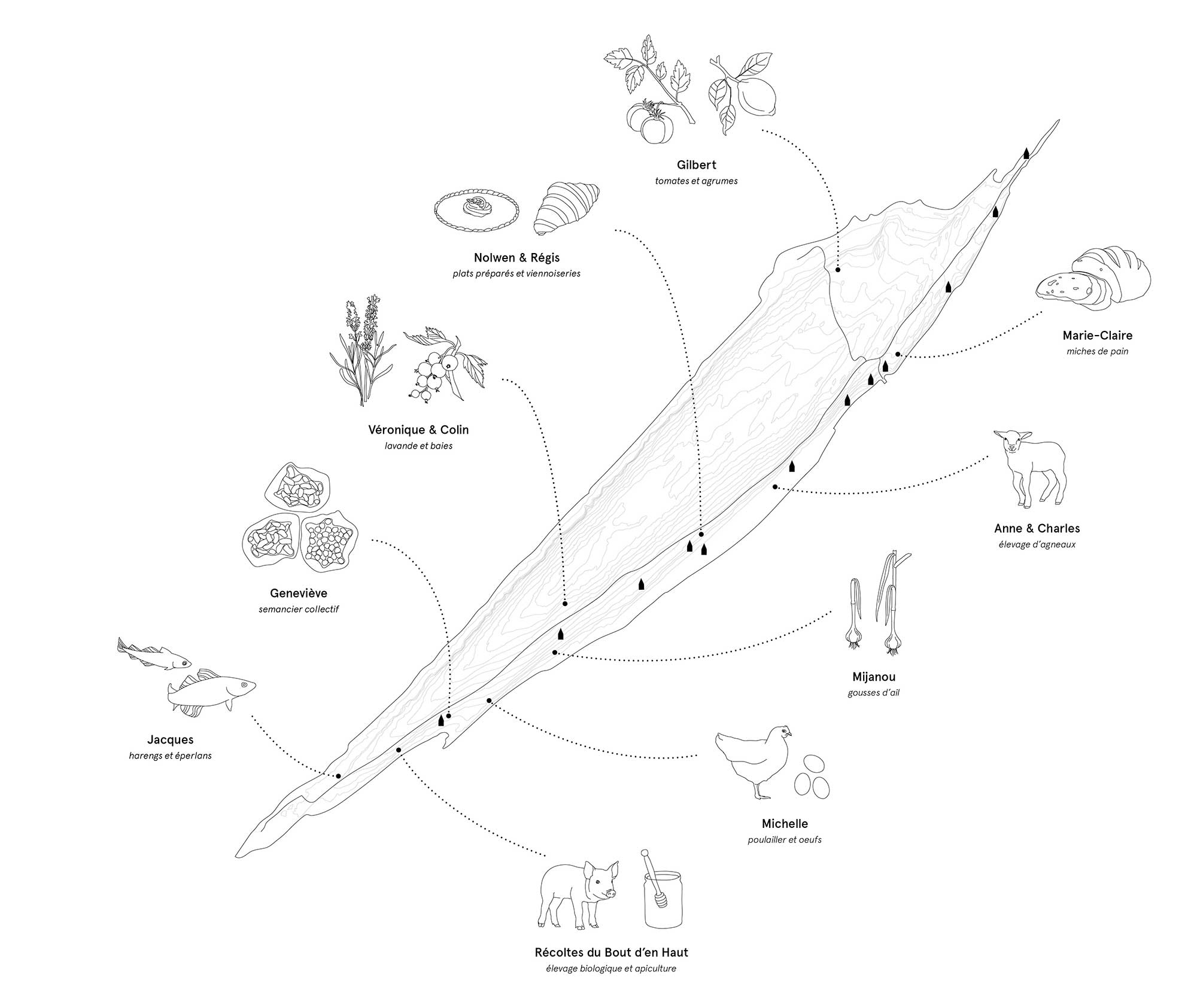 Per comprendere meglio le possibili funzioni delle strutture, gli architetti hanno mappato le iniziative esistenti a supporto dell’autonomia comunitaria. Tra queste: la pesca all’aringa di Jacques; la produzione settimanale di circa venti pagnotte di Marie-Claire; il gregge di venti agnelli di Anne e Charles; il pollaio di Michelle; il collettivo di conservazione dei semi di Geneviève; i piatti e i dolci fatti in casa di Nolwen e Régis; il miele, la lavanda, i maiali, i lamponi e persino i limoni di Véronique e Colin; le coltivazioni di aglio di Mijanou; la serra di pomodori di Gilbert.