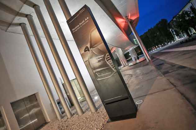 Con il claim A4: progress is intense, Audi ha scelto, per l’anteprima del suo nuovo modello, cinque luoghi d’eccezione: la Fondazione Bisazza di Montecchio Maggiore, gli ex stabilimenti di Fabbriche Sandron a Palermo, il MAXXI di Roma, l’Hangar Bicocca a Milano e la Fondazione Sandretto Re Rebaudengo di Torino.