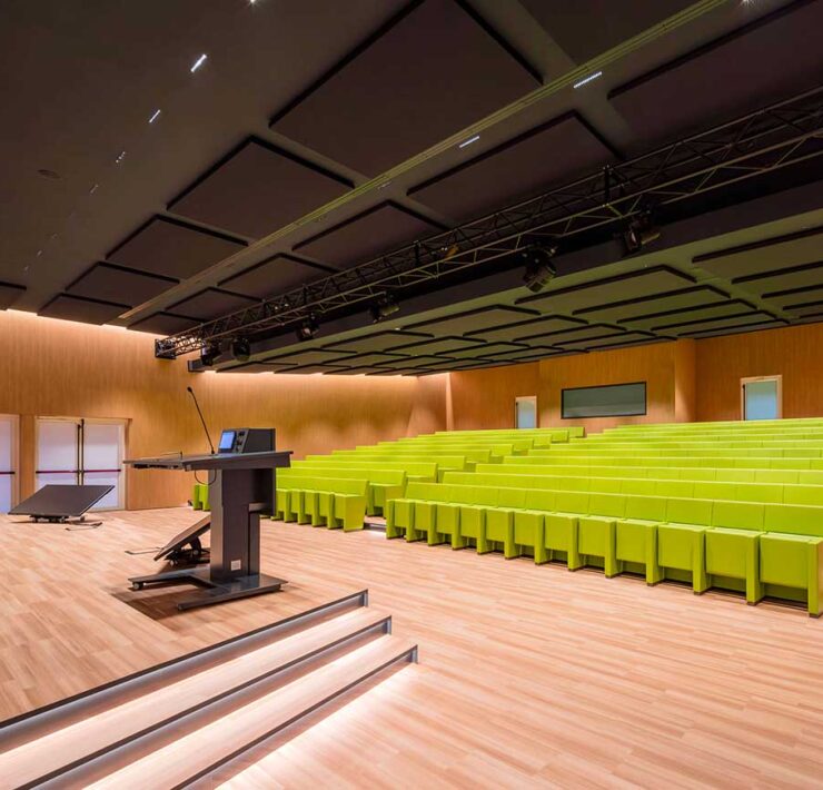 Elemento chiave dell’intervento è la fornitura di arredi LAMM, che ha installato 360 poltrone Flexa disegnate da Dante Bonuccelli. Le sedute, disposte su un pavimento inclinato privo di barriere architettoniche, sono state selezionate in diverse configurazioni per rispondere a esigenze funzionali differenti: dalle versioni con fianco maggiorato e tavoletta ribaltabile con movimento antipanico a quelle con tavolino posteriore e presa integrata.