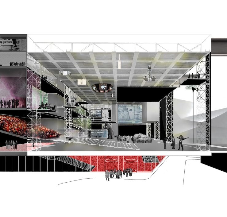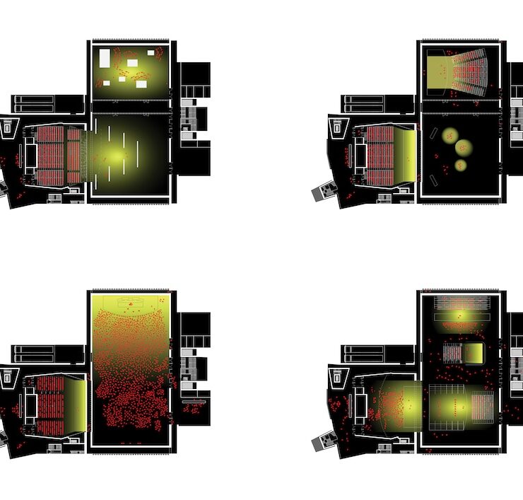 Costruita come uno spazio totalmente flessibile che si adatta a qualsiasi tipo di esigenza, nella warehouse – larga 33 metri, lunga 64 e alta 21 – tutto risulta a vista per poi cambiare conformazione in base all’allestimento che si vuole adottare. Può essere utilizzata come singolo spazio o suddivisa in due, con pareti mobili a tutta altezza che garantiscono l’isolamento acustico. All’interno possono aver luogo produzioni di diverse scale, da piccole rappresentazioni teatrali a concerti con 5.000 persone in piedi.
