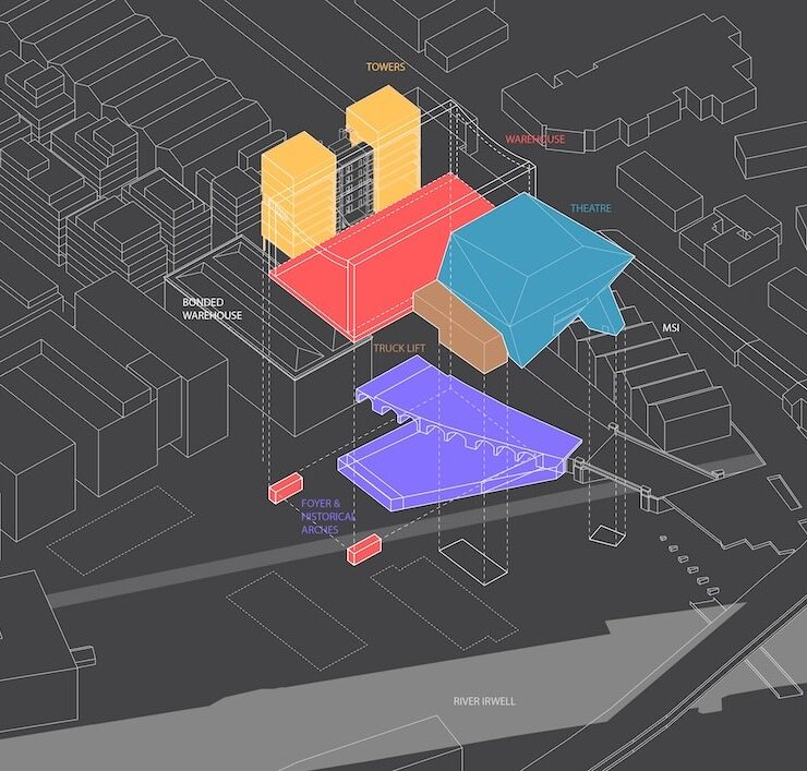 L’architettura è suddivisa in due spazi principali: il teatro e la warehouse, nettamente distinguibili già dall’esterno. Collocato al crocevia delle strade che collegano il museo della Scienza – che quest’anno verrà collegato alla Factory con un passaggio diretto – il centro di Manchester e il canale Irwell, il progetto presenta due diversi prospetti che corrispondono ai due grandi spazi al suo interno.