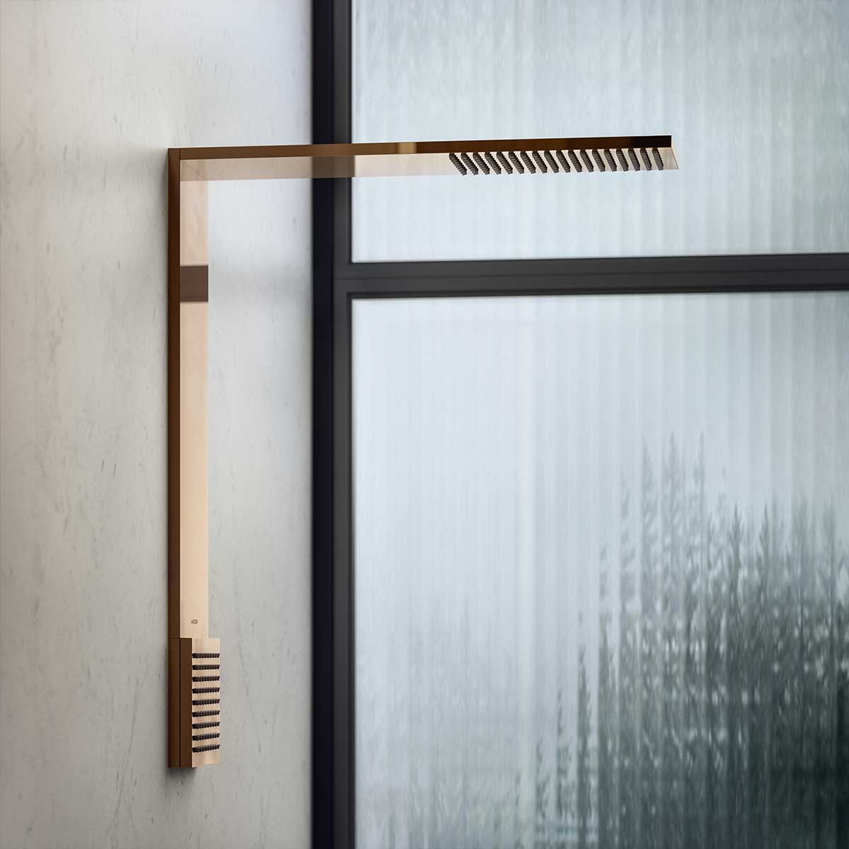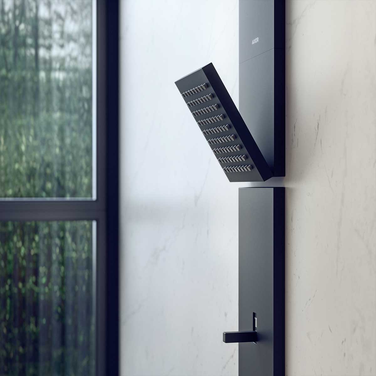 Il design di Axor ShowerComposition è ridotto e lineare, grazie al soffione e ai pannelli che sporgono solamente di 10 mm dalla parete, bilanciando i volumi con superfici estese ed eleganti. La colonna doccia offre funzionalità complete in un unico prodotto, mentre i moduli doccia individuali possono essere combinati e disposti per un’esperienza personalizzata.