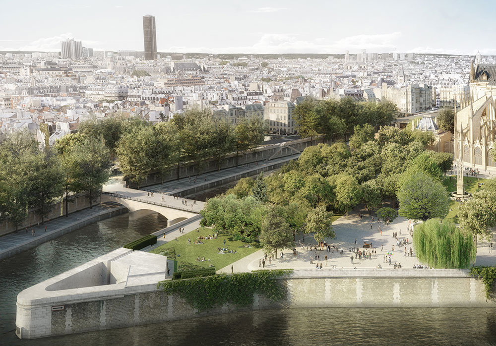 I lavori, che inizieranno nel 2024 per concludersi nel 2027 quando sarà completato il restauro della cattedrale, prevedono anche la trasformazione del parcheggio sotterraneo su due livelli in uno spazio pubblico con una passerella che consentirà al pubblico di accedere da una parte alla cripta archeologica che si trova sotto il sagrato e dall’altra all’acqua della Senna.