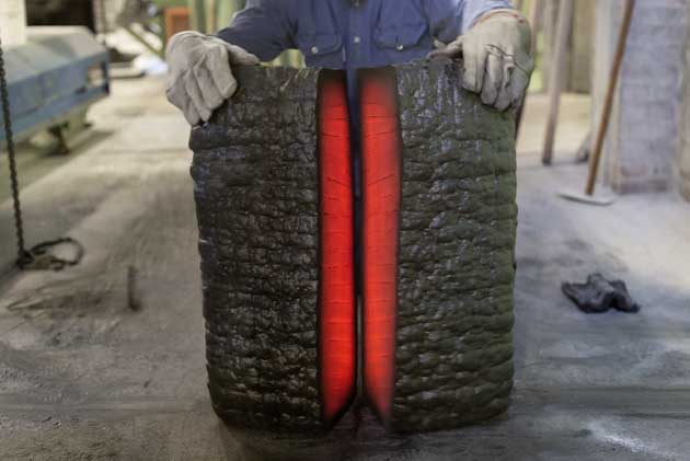 In un forno fusorio il composto si scioglie nel vetro, viene poi polverizzato in una macina e infine mescolato con una piccola quantità di polvere di carbonio.