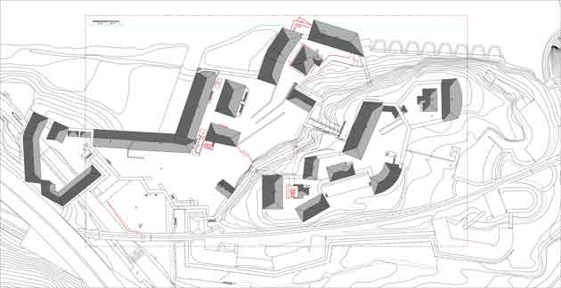 Planimetria generale (i volumi del Talwerk a nord-ovest): in rosso le nuove costruzioni