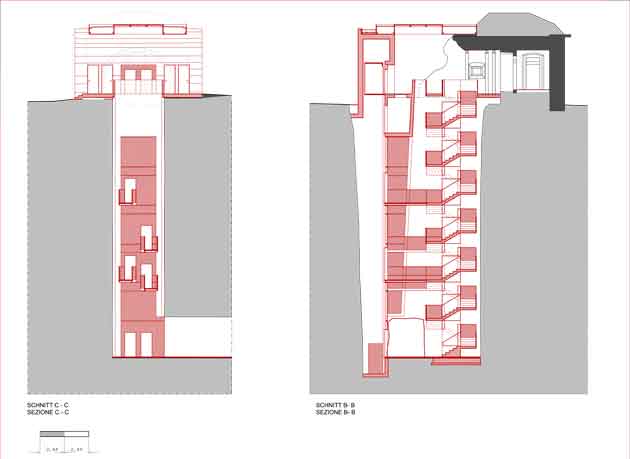 Disegni di sezione della nuova galleria e della scala che attraverso il ricostruito edificio della polveriera conduce all´interno del Forte Medio