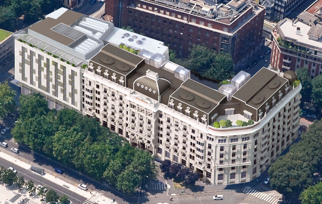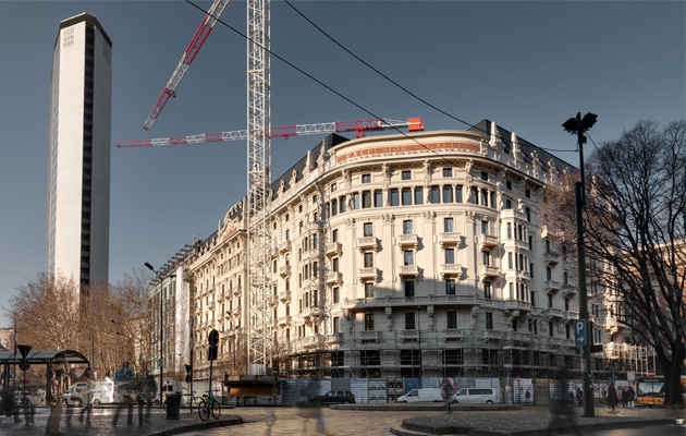 Su richiesta del committente e in accordo con le autorità comunali, la nuova struttura è stata concepita in netto contrasto con l’edificio storico per connettersi alle architetture moderne dell’intorno urbano: la sua facciata in vetro serigrafato con alternanze irregolari di chiari e scuri si propone come un elemento di raccordo tra le texture del grattacielo Pirelli e quelle più distanti della Torre Galfa e dei nuovi edifici di Porta Nuova. L’intervento di recupero ha previsto il restauro del ricco apparato decorativo delle facciate, realizzato tramite tecnica a stampo con una miscela di cemento e inerti, nonché il ripristino dei padiglioni in acciaio posizionati in copertura negli anni ’90 e destinati ad accogliere un ristorante, uno spazio per eventi e una vasta suite con spa privata. L’edificio di nuova costruzione con assetto a corte sarà collegato a tutti i piani del palazzo storico e destinato ad accogliere nuove funzioni: un centro meeting, congressi e mostre al piano terra, una grande spa distribuita tra il 6° e il 7° piano dotata di piscina, palestra, saune, hammam e centro benessere e, sempre al 7° piano, un bar con terrazza panoramica.