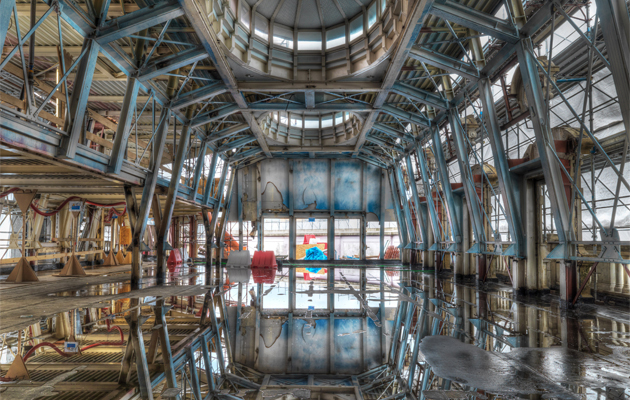 Lavori in corso nei padiglioni in acciaio posti in copertura dell´edificio storico negli anni Novanta