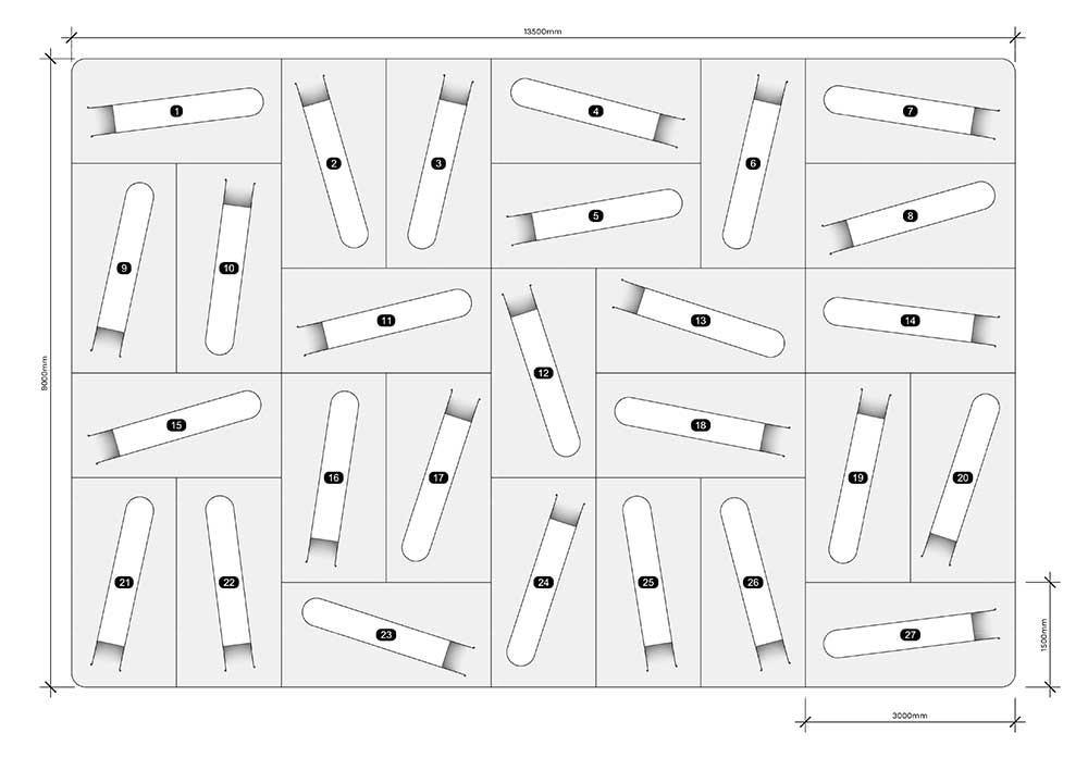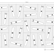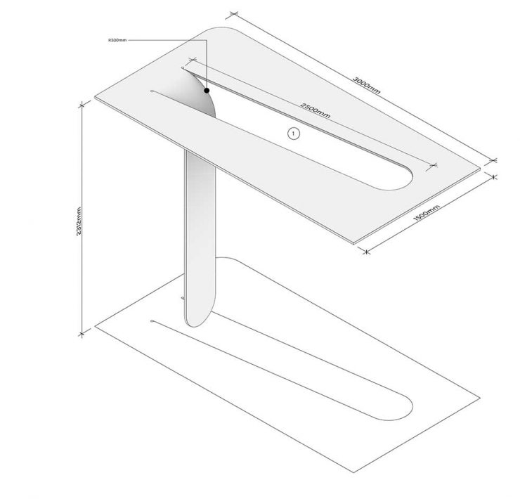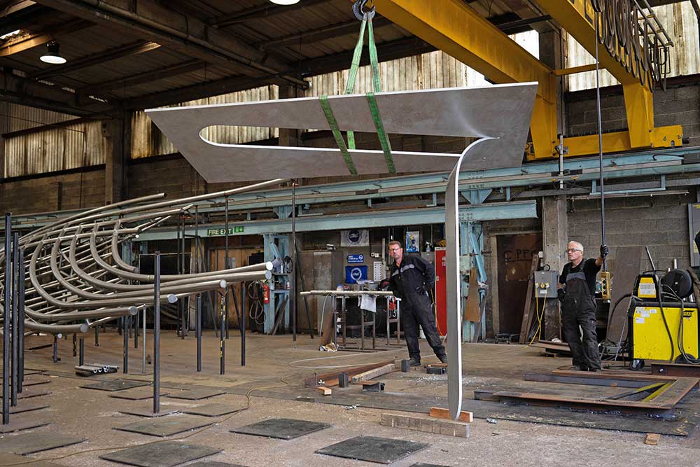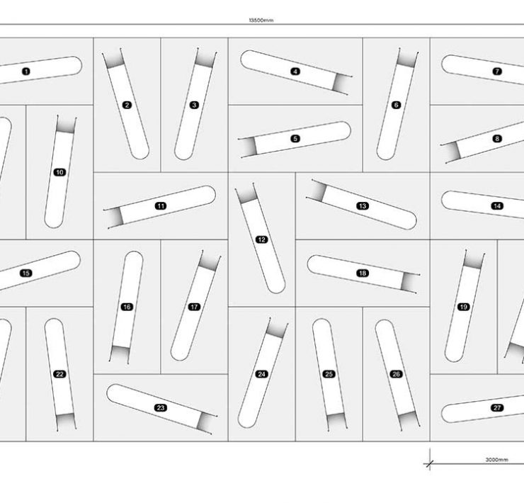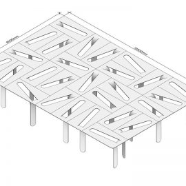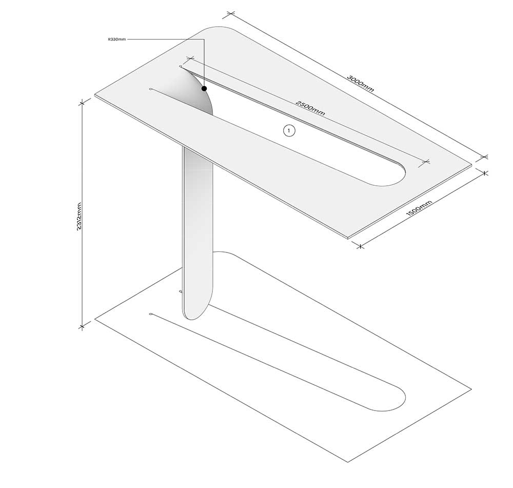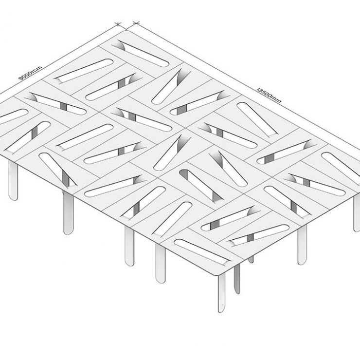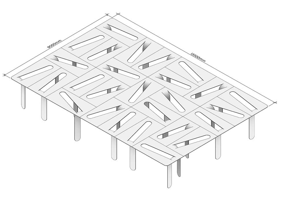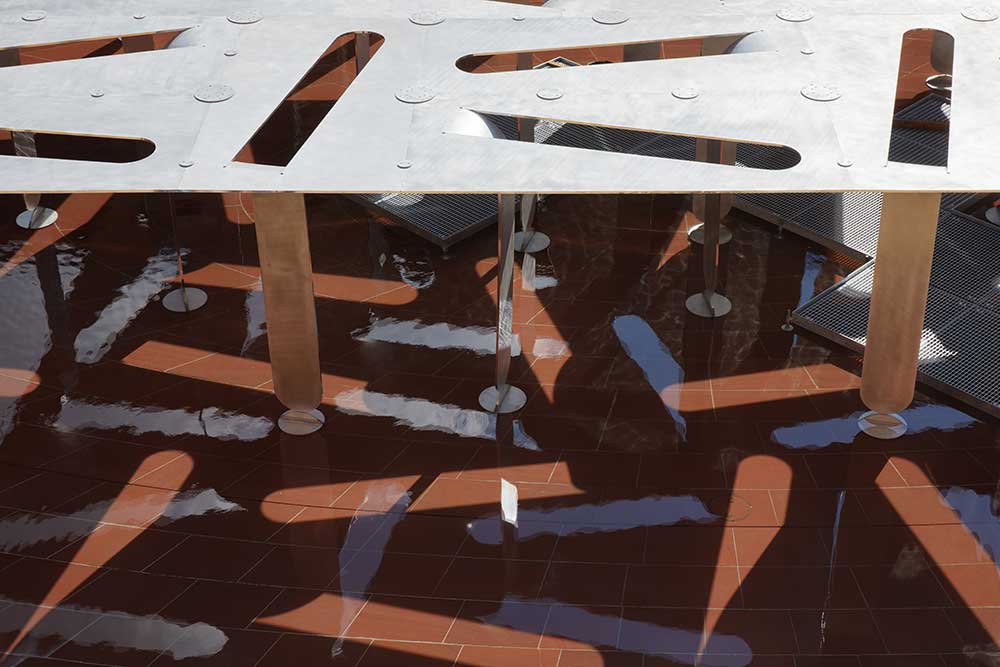 Ritagliate a idrogetto nel centro di ogni lastra e poi piegate, nell’installazione le ‘gambe’ che sostengono la copertura, imbullonate alla superficie con piastre circolari, assumono l’aspetto di tronchi di una foresta artificiale, attraversati, come in un bosco, dalla luce che filtra attraverso i varchi aperti nelle lastre.