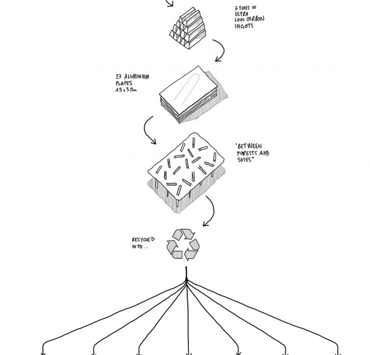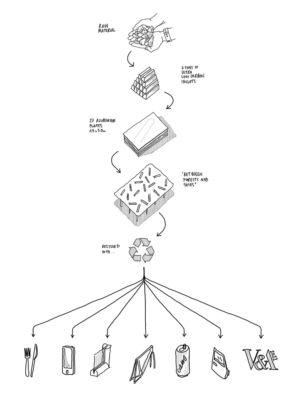 Il progetto è stato commissionato a Nebbia Works da V&A e En+ Group, produttore anglo-russo di alluminio a basso contenuto di carbonio e di energia idroelettrica, per dimostrare le qualità uniche dell’alluminio e soprattutto per promuovere l’alluminio ‘low-carbon’: le lastre infatti sono state prodotte utilizzando una nuova tecnologia che riduce dell’85 per cento il carbonio incorporato nel materiale.