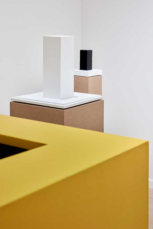 Sol LeWitt. Floor Structure (Well), 1963. Legno dipinto | Painted wood, 133x61x61 cm. (courtesy LeWitt Collection, Chester, CT). Sol LeWitt. Untitled (B3 Model), 1966. Legno dipinto | Painted wood, 35,6×35,6×35,6 cm (courtesy Collection Paula Cooper, New York). Sol LeWitt. Early Wood Structure, 1962 ca. Legno dipinto | Painted wood, 20,6×18,4×18 cm. (courtesy Estate of Sol LeWitt e | and Pace Gallery) |