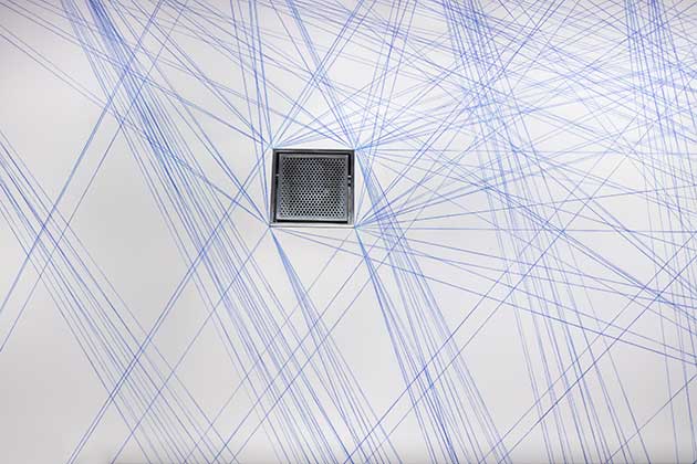 Sol LeWitt. Wall Drawing #51: All architectural points connected by straight lines, 1970. Linee di gesso blu. Disegnato la prima volta da Pietro Giacchi, Andrea Giamasso, Giulio Mosca. Prima installazione, Galleria Sperone, Torino, giugno 1970. LeWitt Collection, Chester, CT (courtesy, Estate of Sol LeWitt) |