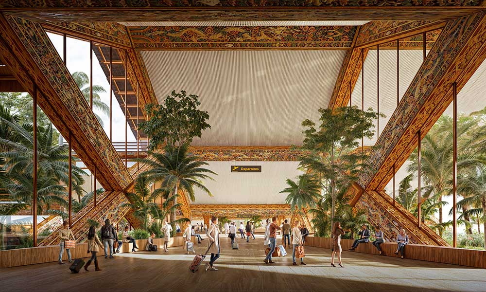 Le strutture in legno dell’aeroporto sono indipendenti, in modo da consentire un facile disassemblaggio in vista di futuri ampliamenti. In copertura, pannelli fotovoltaici contribuiranno al fabbisogno energetico, a conferma dell’intenzione del piccolo Paese asiatico di diventare una nazione a emissioni di carbonio negative.
