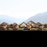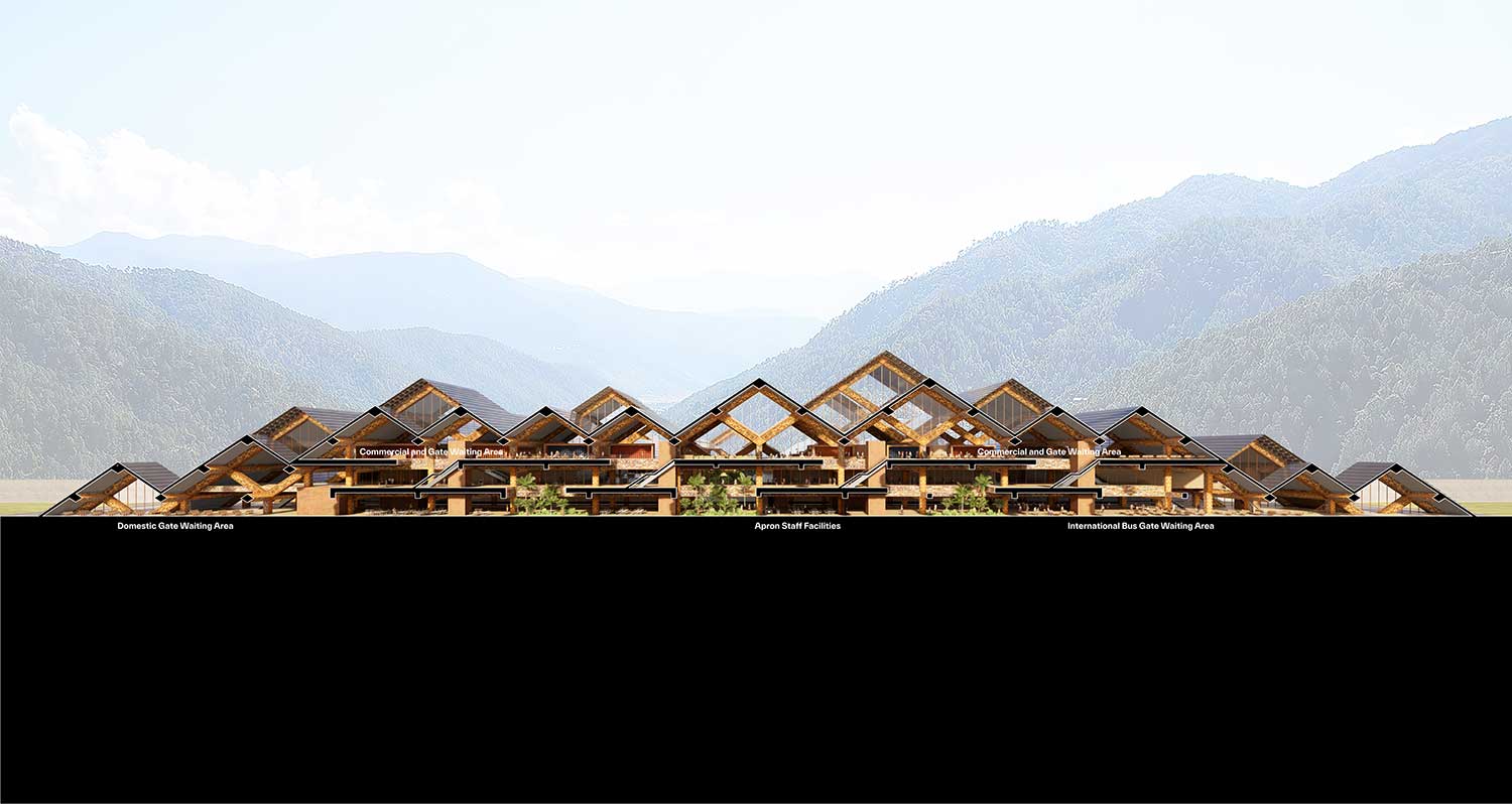 La forma è quella della griglia romboidale basata su travi diagonali che costituisce la struttura in legno lamellare del futuro terminal e ne determina la morfologia. Strategicamente collocato sul confine tra Bhutan e India, sullo sfondo delle cime himalayane e presso il fiume Paitha, quello che sarà il secondo aeroporto del Paese si sviluppa su un’area di 68.000 metri quadrati e potrà gestire 123 voli giornalieri, con una capacità passeggeri prevista di 1,3 milioni di passeggeri, che si prevede possano aumentare fino a 5,5 milioni entro il 2065.