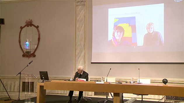 un momento della conferenza stampa di presentazione, con il presidente della Biennale Paolo baratta in dialogo via Skype con le curatrici Shelley McNamara e Yvonne Farrell |