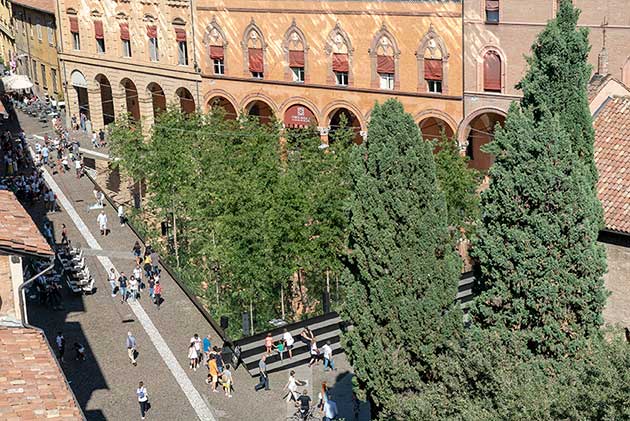 Il progetto – una costruzione geometrica che trasforma l’eterogeneità degli edifici che vi si affacciano in unità formale e guida lo sguardo e il movimento dei visitatori verso gli stretti vicoli medievali e il fondale scenografico del complesso delle ‘Sette Chiese’ – ha trasformato per una settimana lo spazio centrale di Piazza Santo Stefano in un bosco che emerge in maniera dirompente da una base triangolare riflettente, come una ‘lama’ che delimita un’oasi naturale.