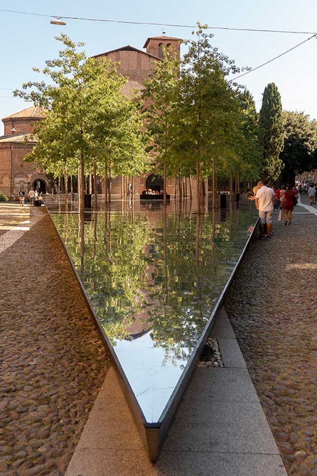 | La lama riflettente che esce dal bosco di piazza Santo Stefano così come l´hanno progettata i giovani professionisti della SOS School of Sustainability di Mario Cucinella (courtesy MCA) |