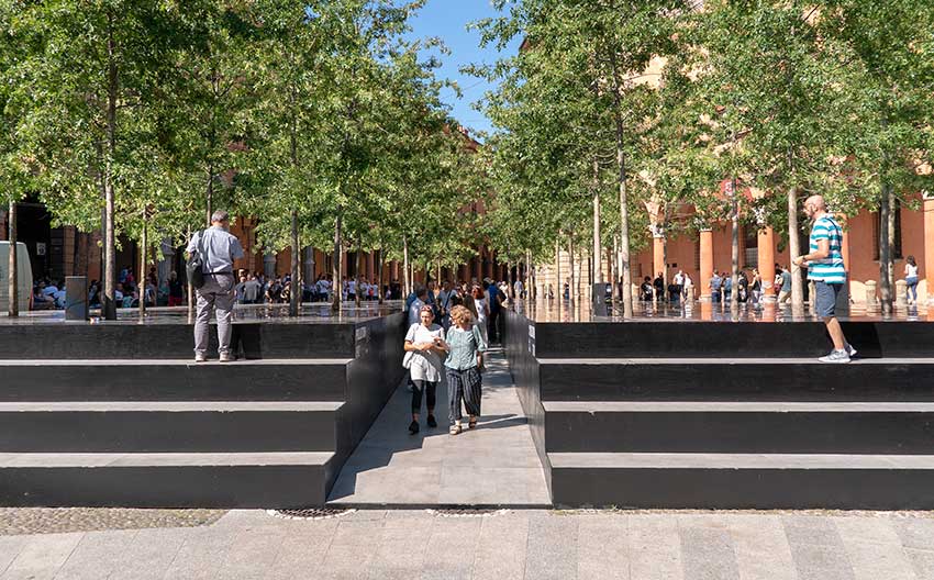 Pollution-RefleAction, la più clamorosa installazione della BDW, voluta da Iris Ceramica Group, è frutto del progetto di Mario Cucinella e del suo studio insieme agli studenti dei master post-laurea della sua S.O.S. – School of Sustainability, che hanno trasformato il triangolo acciottolato tra la basilica di Santo Stefano e Palazzo Isolani in luogo di manifestazioni artistiche, tra letture e musica, e di riflessione sulle relazioni tra l’uomo e l’ambiente.