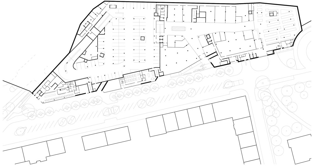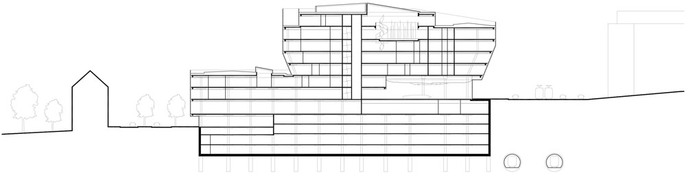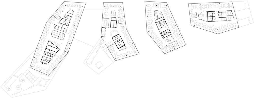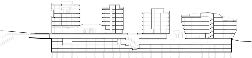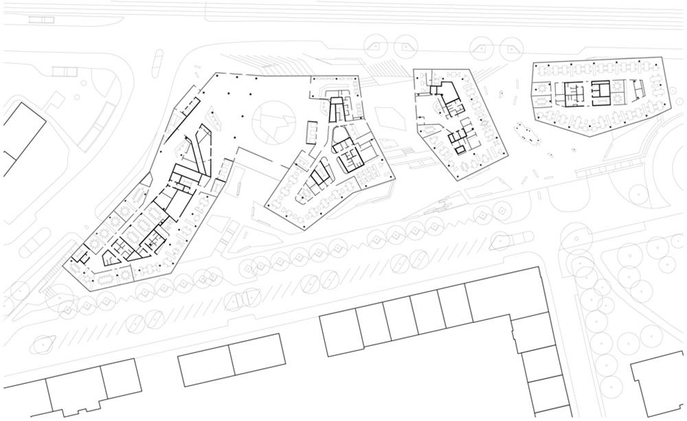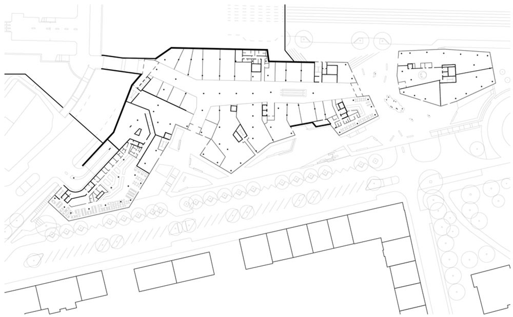 Il nuovo edificio vuole essere una porta di accesso a servizi e infrastrutture e una piazza di incontro con ristoranti, caffè e negozi. Sulla sommità del podio, infatti, i quattro complessi emergenti a forma di diamante sono completati da altrettante zone aperte di transito e sosta, un parco verde ripiantumato, due percorsi con scale e uno senza barriere architettoniche.
