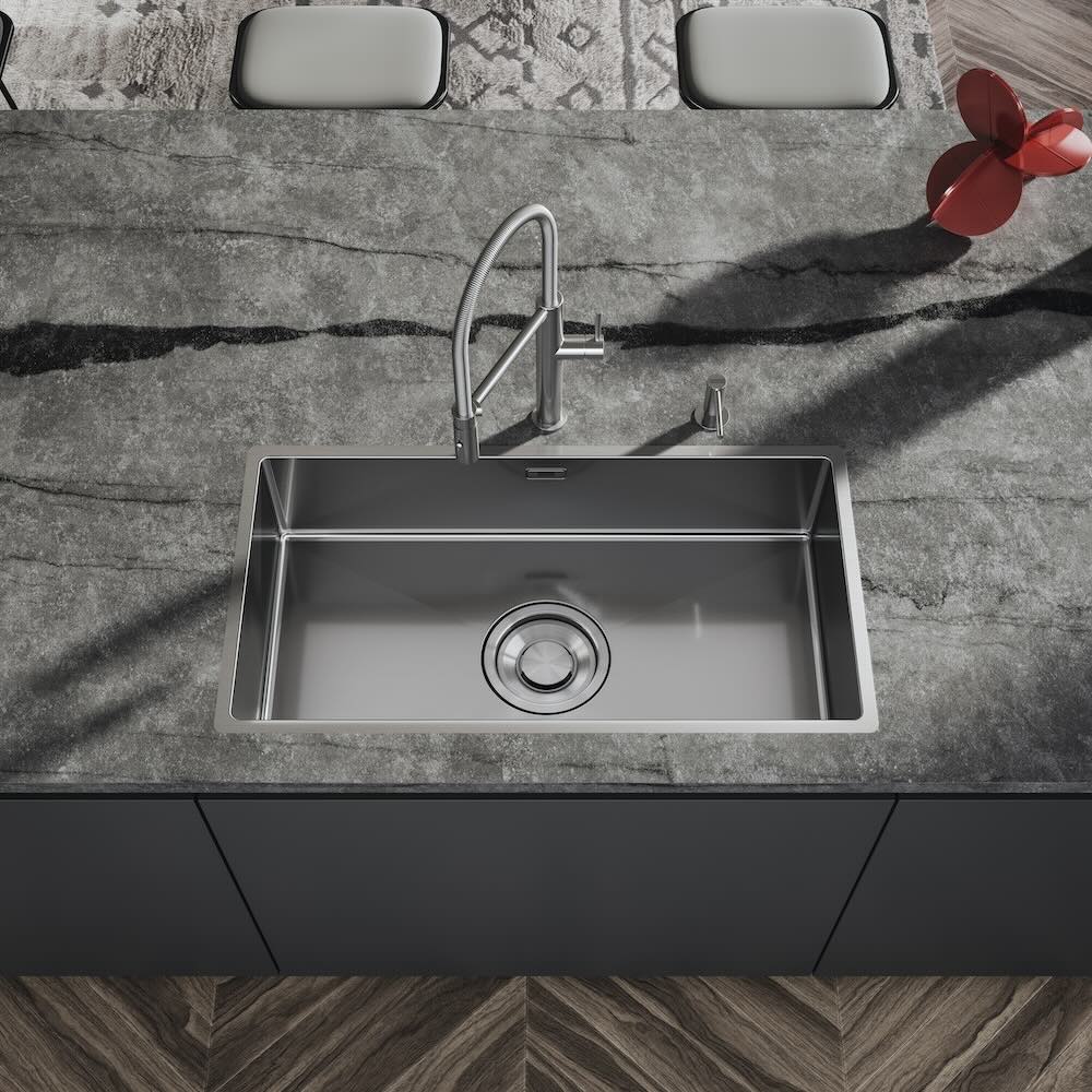 Al centro del sistema c’è il nuovo scarico da 7”, che favorisce un deflusso più rapido e continuo. Il cestello raccogli-rifiuti in acciaio inox, removibile e dotato di cover, semplifica la manutenzione e contribuisce a limitare gli odori. Il disegno è essenziale, con angoli arrotondati raggio 12 e finitura spazzolata; la gamma è disponibile in tre dimensioni per basi da 60 cm. Sul fronte del comfort, la tecnologia Sound Soft riduce sensibilmente il rumore, intervenendo con patch fonoassorbenti distribuite sulla vasca. Il sistema si inserisce nella gamma Mythos ed è installabile sottotop, a filo o semifilo, con una serie di accessori – rollmat, tagliere in acero, vaschetta in acciaio – che estendono l’uso del lavello nelle diverse fasi di preparazione.