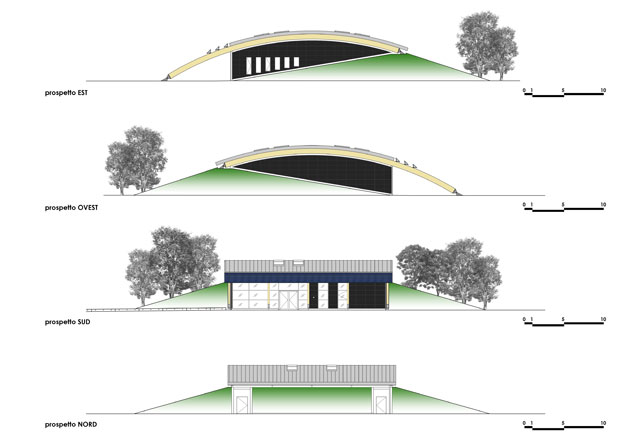 L’edificio presenta una forma ad arco molto snella; gli impianti e in particolare il vano tecnico che ospita le unità di trattamento aria e le pompe geotermiche sono interrati nel lato nord, nascosti alla vista. Anche le griglie di ventilazione esterne per le prese d’aria sono occultate sotto la parte del tetto che va in aggetto. Al fine di avere un carico sul terreno minimo e di ottenere una pianta il più libera possibile, sono stati realizzati archi con travi di abete lamellare, 33 metri di luce, che si sorreggono da soli. Sono agganciati all’estremità sud ai plinti nel terreno, e a nord ai muri del vano tecnico che fungono da contrafforti. Il tutto è messo in tensione dalle fondamenta.