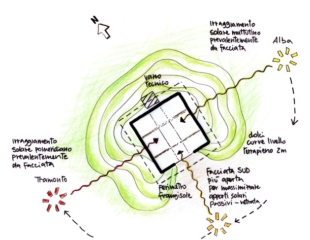 Le pareti perimetrali sono costituite da uno strato di cartongesso a doppia lastra, 25 cm di CA, 25 cm di fibra di legno e un rivestimento in gres porcellanato nero che funge da facciata ventilata. A questi materiali, sul lato sud si aggiungono ampie superfici vetrate con vetrocamera bassoemissiva con trasmittanza totale certificata di 1,15 W/mq K. Compone il tetto una struttura di pannelli in legno di abete spessi 5 cm, supportata da un’orditura primaria e secondaria in abete lamellare con 30 cm di fibra di legno e un rivestimento in lamiera di alluminio. Sul solaio in CA che ricopre il vano tecnico si trova uno strato di terra inerbito, dunque non coibentato, che degrada sui lati e avvolge l’edificio, che appare incastonato nel terreno.