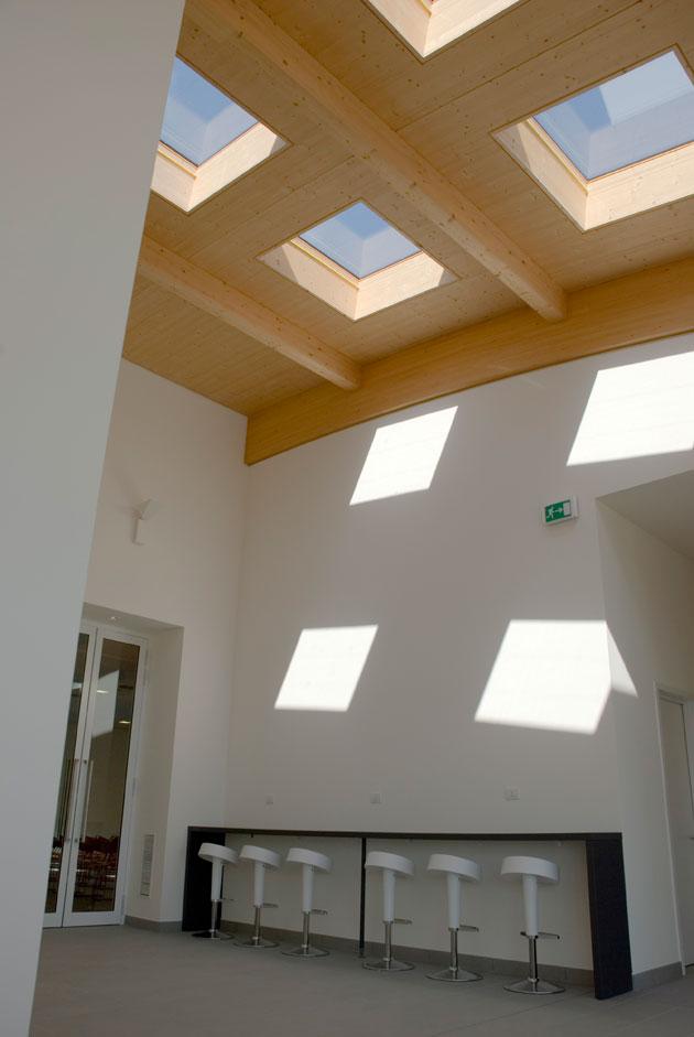 Sono quattro i principali ambienti interni: foyer di ingresso, uffici, sala riunione e sala conferenze: queste ultime, separate da una porta scorrevole, possono essere trasformate in un unico auditorio. Le finiture e i colori dei muri neutri rendono gli arredi più leggibili. Piacevole il gioco delle altezze: il foyer, molto alto, esprime in tutta la loro bellezza le arcate, evidenziate da quattro lucernari. La sala conferenze ha un controsoffitto in alluminio alveolare anodizzato microforato, che ottimizza la resa acustica e nasconde i canali di ventilazione. Inoltre, il soffitto è composto da una parte solida nella quale sono inserite le bocchette, le luci e gli speaker, e da un´altra parte aperta con lame verticali che permettono di vedere la volta e il cielo tramite lucernari.